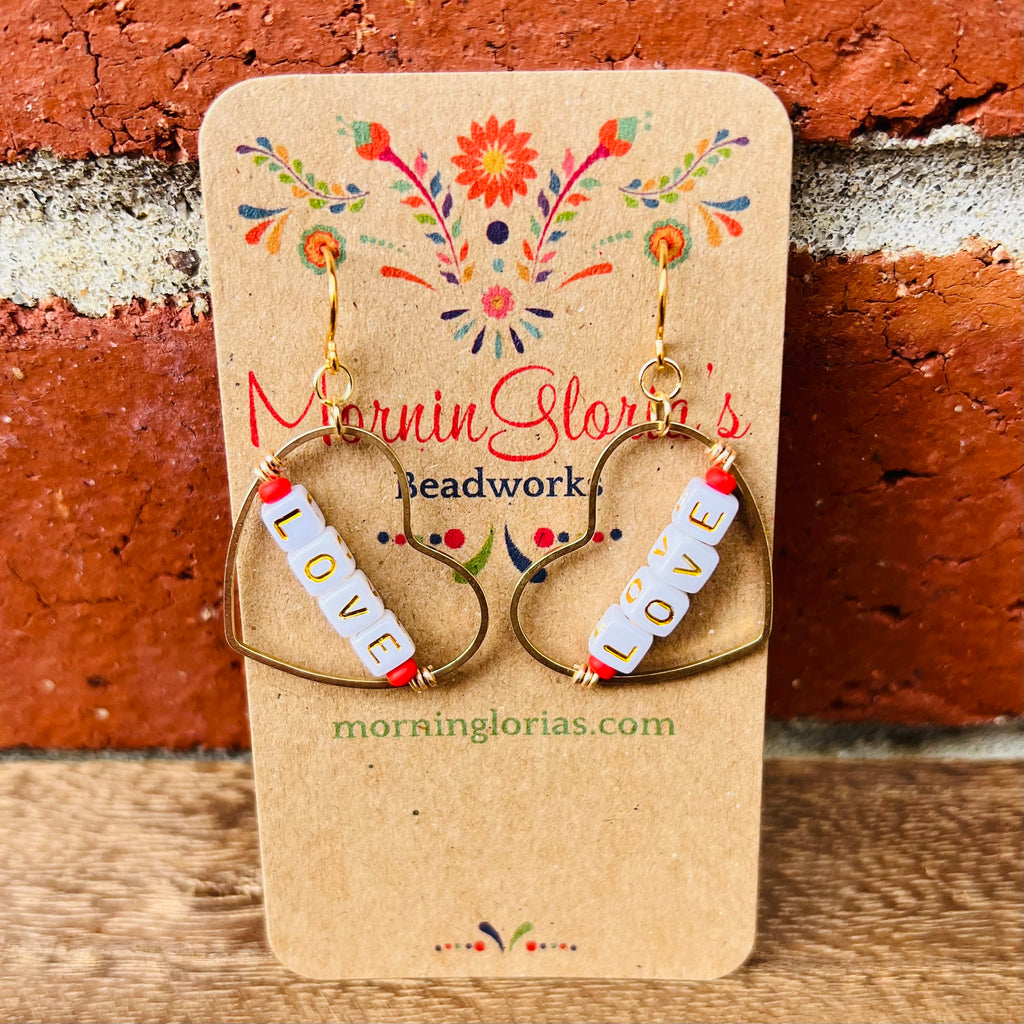 These are my version of conversation heart earrings! Featuring teeny tiny 5mm letter beads sandwiched by matte seed beads and set on a raw brass heart. Set on brass french hook earwires. Measures 1 inch wide and 1 inch tall.